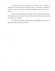A terceira etapa descreve o funcionamento do sistema de custo, o conjunto de informações contábeis e gestora para aferição dos custos, o monitoramento de orçamentos e decisões de preço de venda. Além de exemplos de planilhas de custos fixo, variável e o estoque.