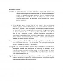 - Skinner propõe que o método histórico deve situar o texto em contexto histórico que nos permita identificar o que os autores estavam fazendo ao descrevê-los. Esclarece que “se quisermos compreender tais textos, devemos ser capazes de oferecer uma explicação não meramente do significado do que foi dito, mas também do que o autor em questão pode ter tido a intenção de dizer ao dizer o que disse”. Propõe a distinção entre aquilo que o texto diz (significado) e aquilo que o autor faz ao dizer o que diz (ato linguístico). Neste ultimo refere-se às indagações: Quais questões o autor se debruçava? Quais questões ele tentava formular soluções?